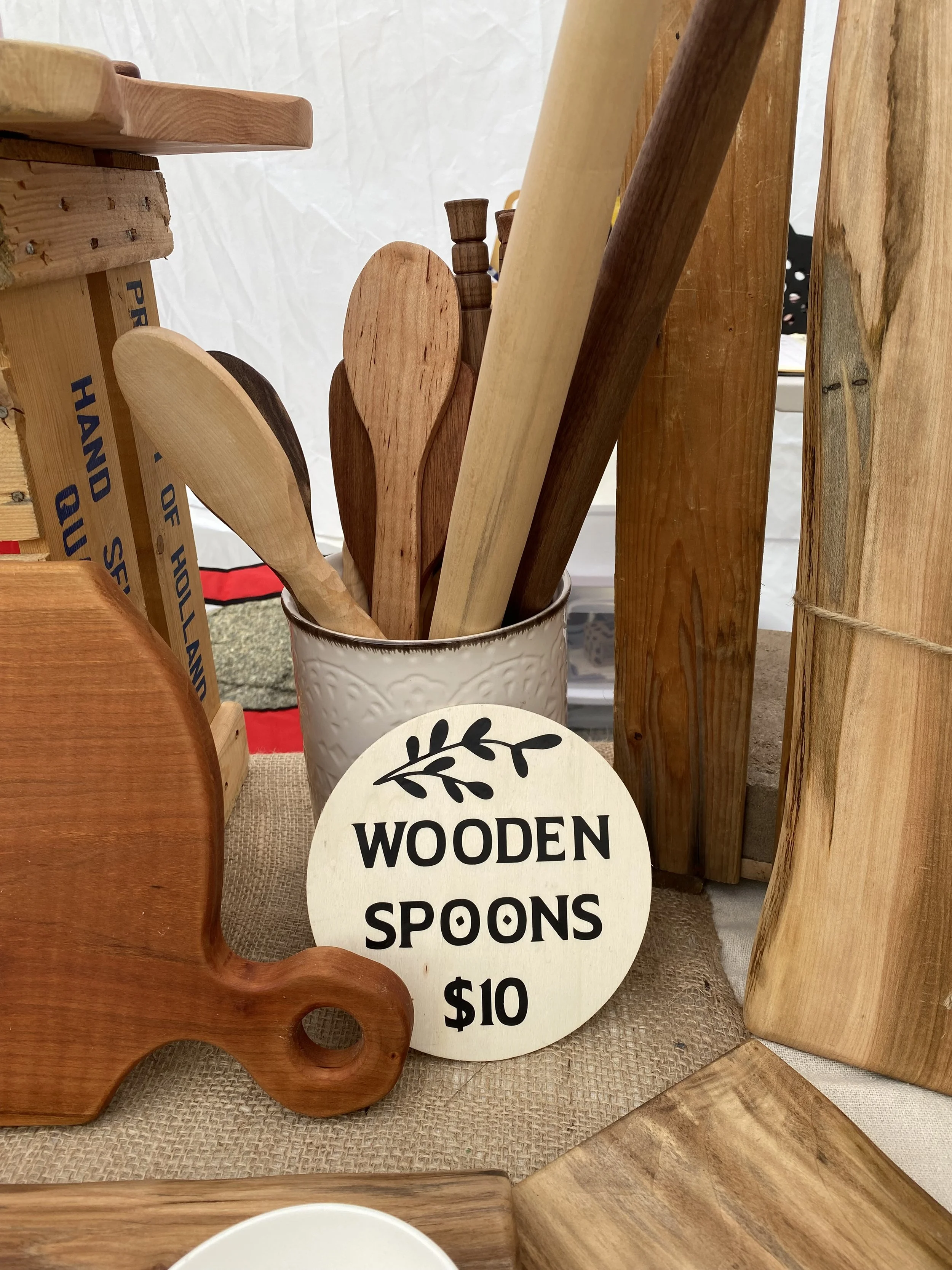Gorgeous handcrafted wood kitchenwares. Charcuterie and cutting boards, bread knives, bottle openers, spoons and spurtles.